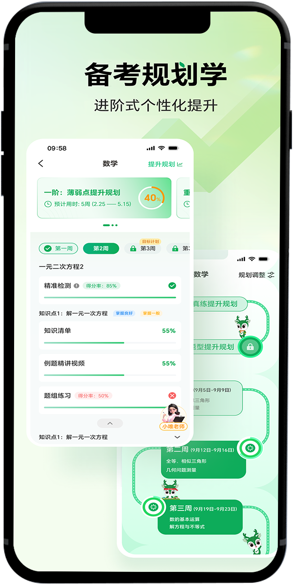 备考规划学:针对陕西初三考生量身定制,涉及数学、物理、化学学科(未来增加英语)。严格依据陕西中考考情,内容覆盖中考常考命题点,通过测、评、学、练、伴五大备考环节,精准定位薄弱点,为学生定制个性化的三阶提分规划。