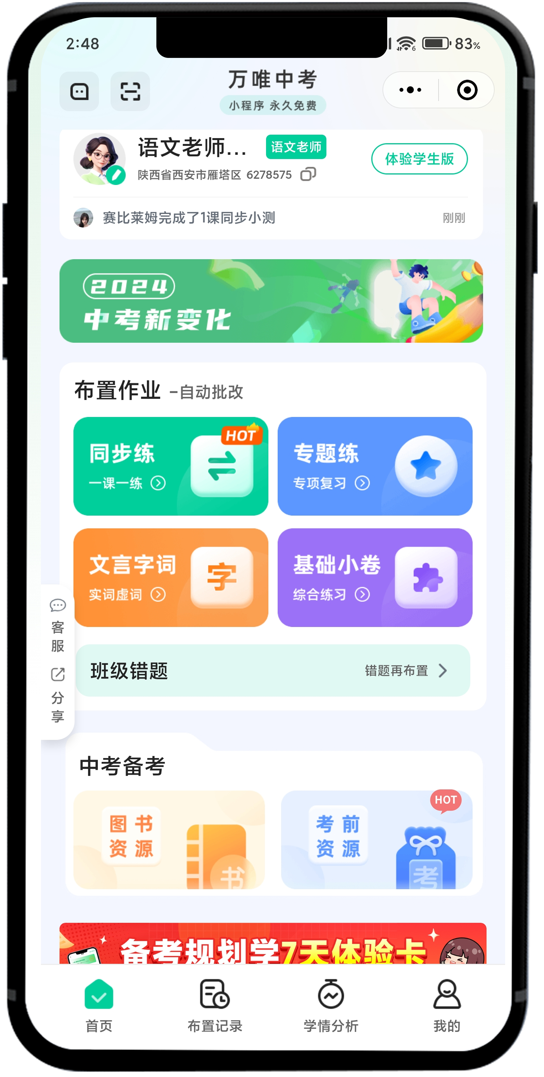 另外,学习打卡还能领唯币,免费兑换万唯图书、周边,激发学生的学习兴趣和积极性,养成学习好习惯。万唯中考小程序让教学更轻松,让学习更容易,1000万+师生的不二之选!