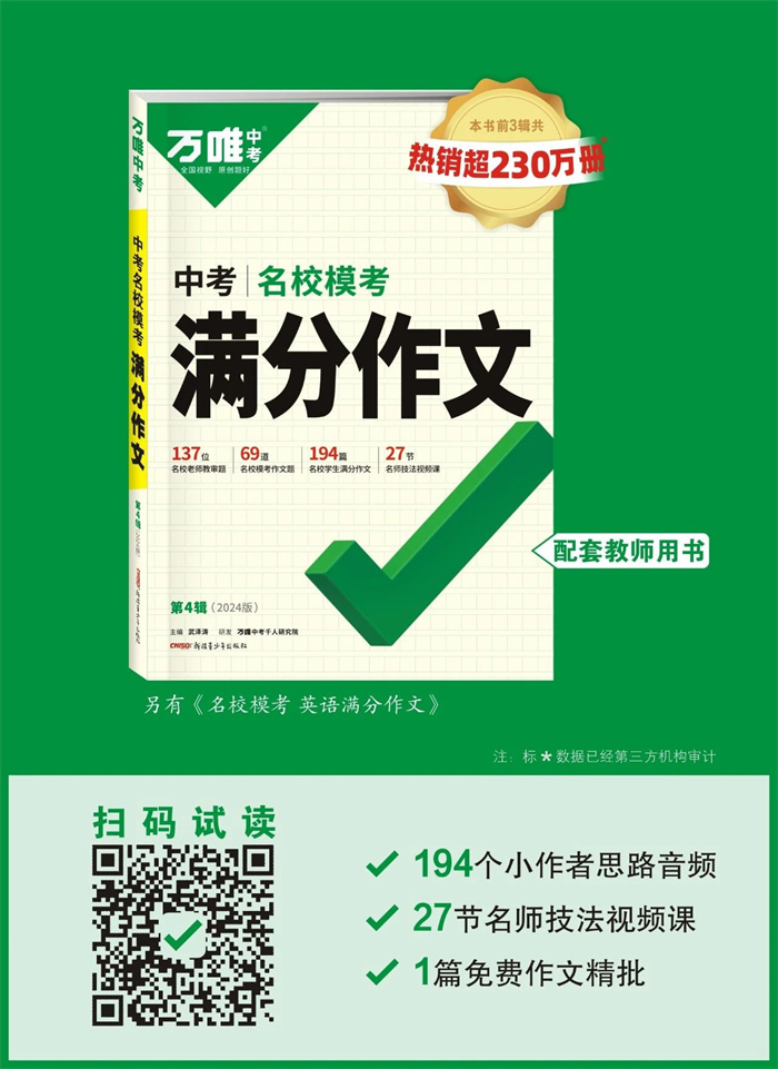 万唯中考千人研究院联合一线名师,重磅推出2024版中考《名校模考 满分作文》。通过“名师教审题”+“新趋势作文题目”,帮助老师教会学生审题,明确作文备考方向,指导学生写出考场佳作。