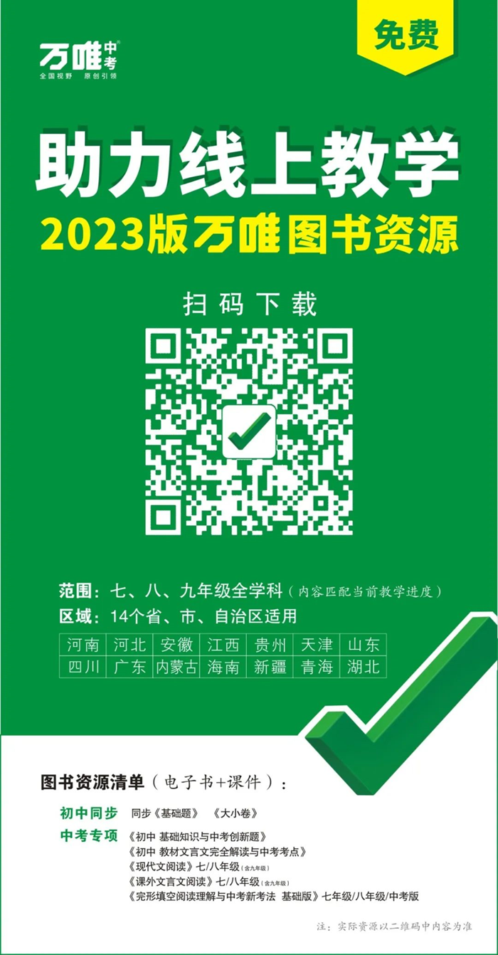 9月开学以来,各地开启新学期教育教学工作。近日来,受到疫情影响,河北、安徽、江西等14个区域的部分地市陆续发布消息,暂停线下教学和服务,实施线上教学。万唯中考特为广大师生精心准备了2023版万唯图书资源(电子书+课件)和小程序,助力线上教学。