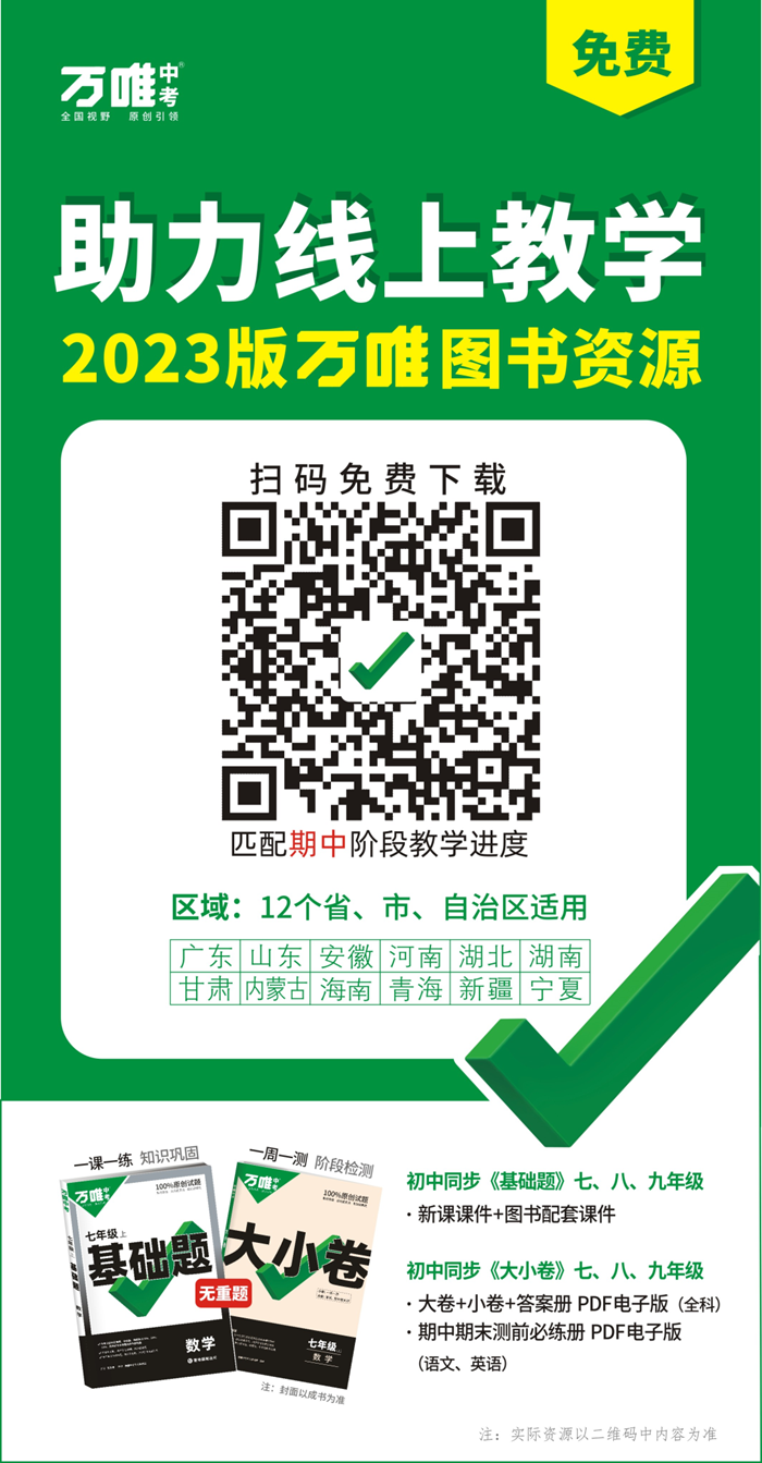 为持续助力广大师生线上教学,万唯中考免费提供三大教学资源及服务——2023版图书资源(电子书+课件)、中考教学公益备考课程、万唯小程序。截至目前万唯已持续为全国25省区市提供了免费服务及资源。